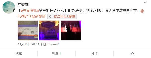 王胜男(中国地质大学):我国当今的歌剧制作及宣传,还属于政府行为。歌剧并不能像电影一样,带来可观的收入。很少有商家,愿意冒着亏本的危险投资制作歌剧。而政府的宣传,其范围又是相对窄小的,其不盈利的性质决定了它有限的受众。就歌剧《赵氏孤儿》而言,它的观众大部分是来自艺术界的前辈或者对故事本身有一定了解的中老年人。不了解歌剧的年轻人对它的兴趣微乎其微。而我们所熟知的,还仅限于《白毛女》等传统抗战歌剧。