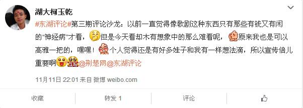 刘爽爽(中国地质大学):在国内,其实《洪湖赤卫队》也是歌剧在中国的创新,那首脍炙人口的《洪湖水浪打浪》也是歌剧唱腔的一种。在如今高校话剧社林立之际,不妨尝试建立歌剧社,消除大众对歌剧的隔膜,就先从演出《洪湖赤卫队》这部平易今人的歌剧开始。