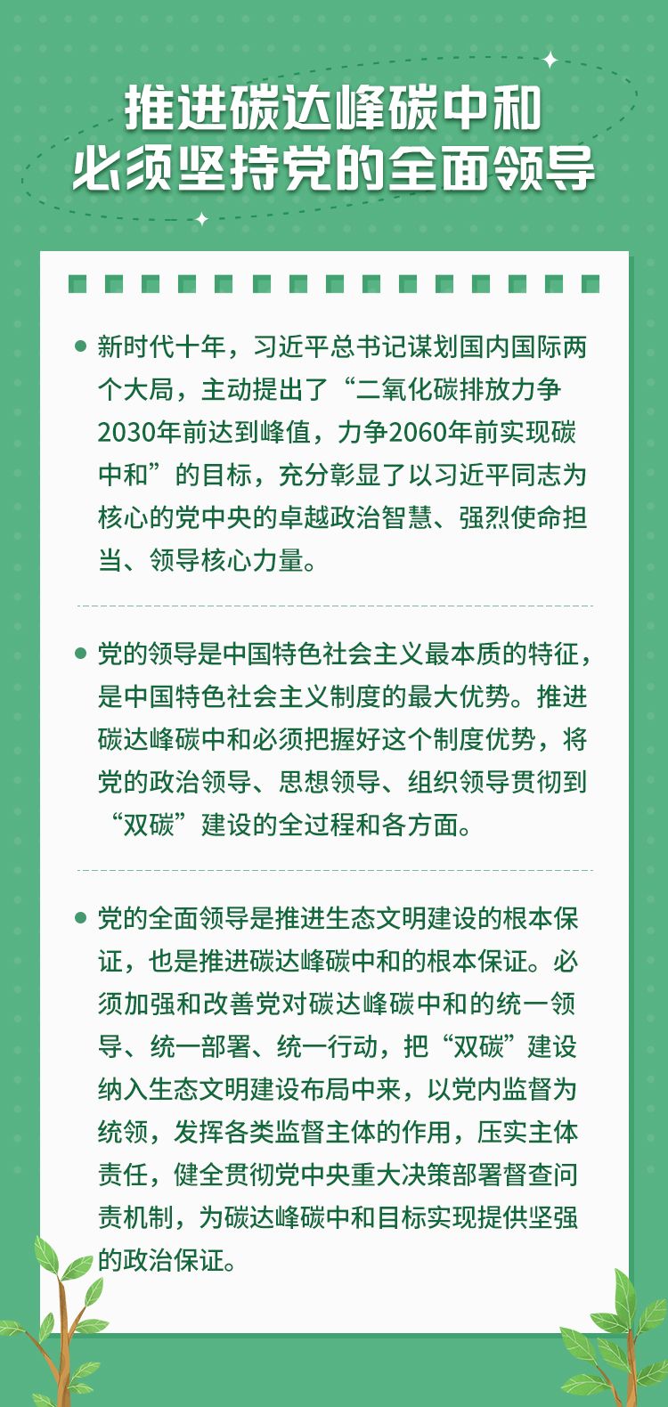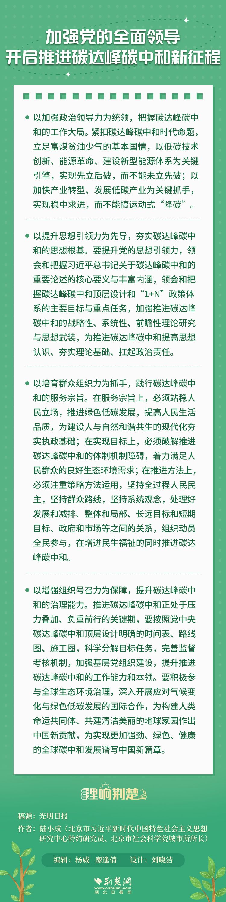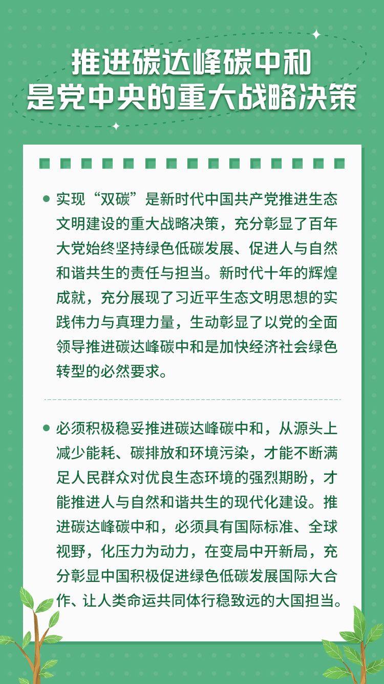 党的二十大报告明确提出,积极稳妥推进碳达峰碳中和。这是以习近平同志为核心的党中央坚持以人民为中心、破解资源环境约束突出问题、实现人与自然和谐共生的现代化所作出的战略部署,也是新时代推进生态文明建设、推动绿色发展所擘画的宏伟蓝图。坚持和加强党的全面领导,是推进碳达峰碳中和的政治保证。新征程上,积极稳妥推进碳达峰碳中和,必须坚持和加强党的全面领导,发挥党的政治领导力、思想引领力、群众组织力、社会号召力,奋力开创人与自然和谐共生的中国式现代化新境界。