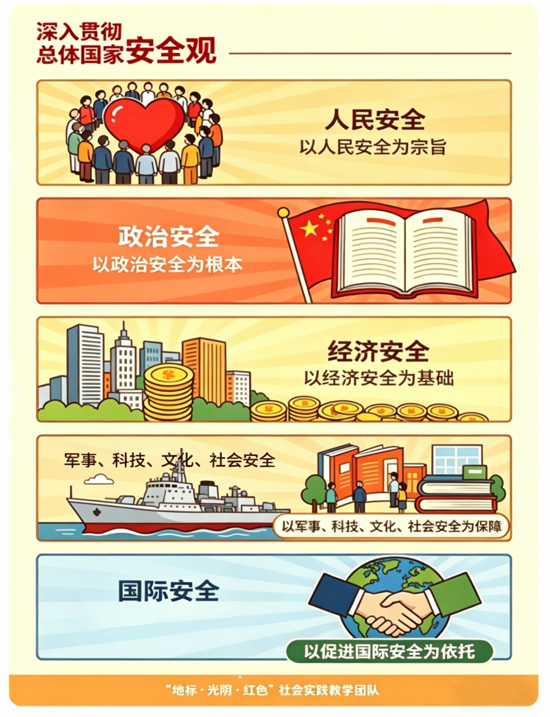 总体国家安全观以人民安全为宗旨,以政治安全为根本,以经济安全为基础,以军事、科技、文化、社会安全为保障,以促进国际安全为依托,维护各领域国家安全,构建国家安全体系,走中国特色国家安全道路。