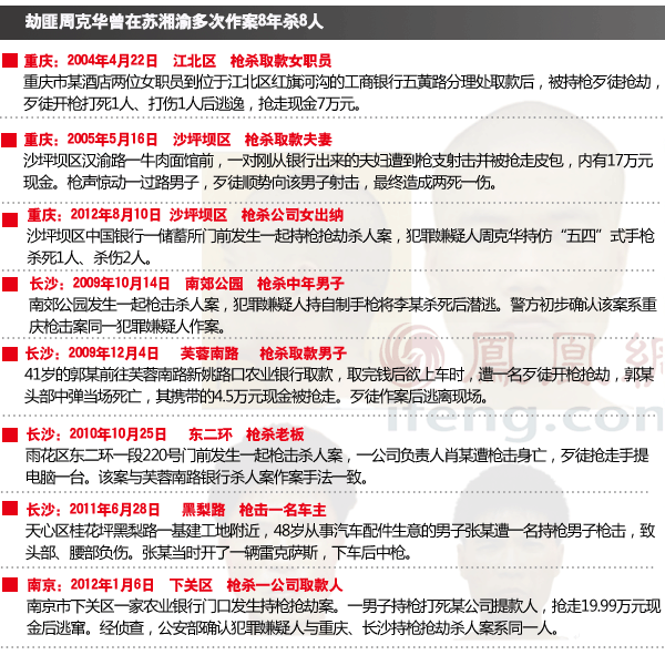 重庆沙坪坝区发生持枪抢劫案后,重庆警方的通报中称,自2004年以来,犯罪嫌疑人周克华在江苏、湖南、重庆等地多次作案,杀死杀伤多人,抢劫巨额现金。有人即与南京“爆头哥”相联系,怀疑两人系同一人。记者从江苏省公安厅内部人士处证实了这一消息,两地的案子系同一人所为。