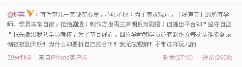 那英在微博中写到:“有件事儿一直哽在心里,不吐不快:为了尊重观众,「好声音」的所有导师、学员非常自律,拒绝剧透;制作方也再三声明反对剧透;但播出平台却"监守自盗"抢先播出我队学员考核,为了节目好看,四位导师和学员还有制作方每次从准备到录制夜夜到天明!为什么却要拆自己的台?!我无法理解!不带这样玩儿的。”