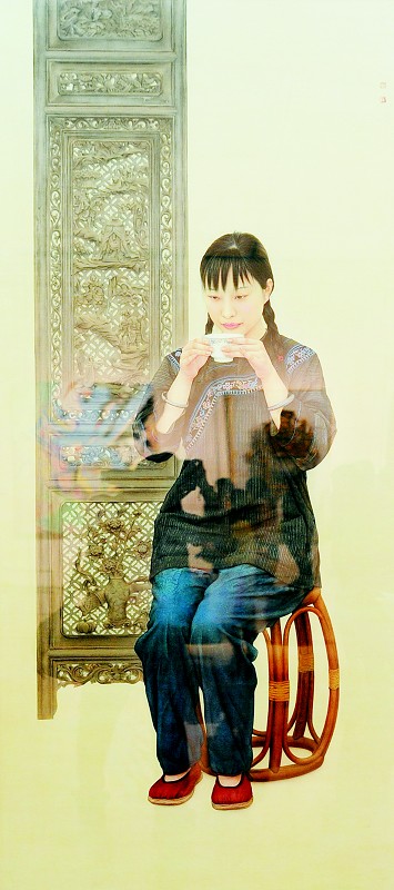 村姑装扮的女子正低头端起一杯茶,身后只有一扇屏风。大量留白的国画《聘》却从女子有些羞涩忐忑的目光中流露出千言万语。