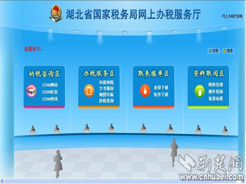 湖北省国税局网上办税服务厅对原有的网上办税系统进行界面整合,并增加了较为全面的服务功能,按实体办税服务厅的模式设置纳税咨询区、办税服务区、取表填单区和资料取阅区。