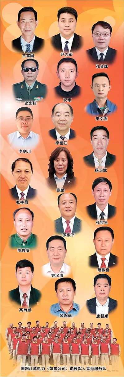 国网江苏电力(如东公司)退役军人党员服务队,于2001年7月由4名退役军人党员共同发起,先后有75名退役军人参加,现有52名退役军人。18年来,他们始终恪守党的宗旨,坚持准军事化管理,为百姓提供应急抢修、免费对企业开展用电安全、节能减排、运维管理等方面的“电力体检”、保障重大项目建设用电、义务帮扶社会弱势群体,先后资助百余名孤寡老人、伤残军人、革命老红军等,其中6名成员更是坚守承诺照顾烈士父母35年,群众满意率100%。曾获中国好人、全国用户满意服务明星班组、全国模范职工小家等称号。