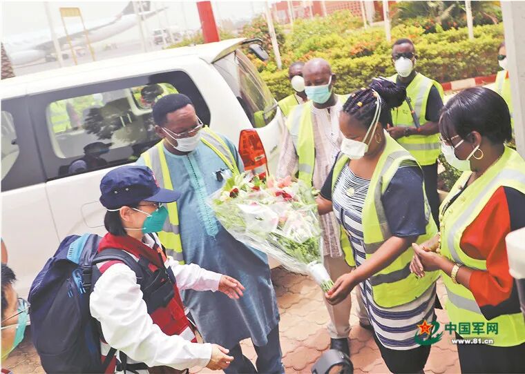 4月16日,在布基纳法索首都瓦加杜古,布方代表欢迎中国政府派遣的抗疫医疗专家组专家。新华社发