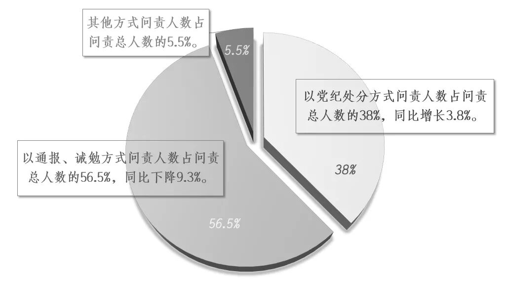 规范问责方式,以党纪处分方式问责的人数比例上升,以通报、诫勉等方式问责的人数比例下降。2019年全国以党纪处分方式问责人数占问责总人数的38%,同比增长3.8个百分点,“严”的主基调得到了有效坚持。以通报、诫勉方式问责人数占问责总人数的56.5%,同比下降9.3个百分点,这反映出各地区各部门按照“三个区分开来”要求,把严管和厚爱、激励与约束有机结合,有效纠正了一些地方“动辄问责”的倾向。同时,各地加强审核指导,明确不得将没有法规依据的口头教育、警示约谈等作为问责方式,问责方式进一步规范。