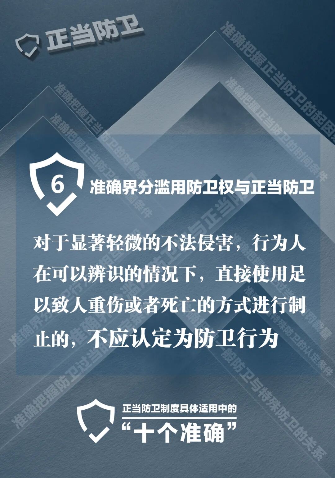 六是准确界分滥用防卫权与正当防卫。《指导意见》第十条要求防止将滥用防卫权的行为认定为防卫行为,“对于显著轻微的不法侵害,行为人在可以辨识的情况下,直接使用足以致人重伤或者死亡的方式进行制止的,不应认定为防卫行为。不法侵害系因行为人的重大过错引发,行为人在可以使用其他手段避免侵害的情况下,仍故意使用足以致人重伤或者死亡的方式还击的,不应认定为防卫行为”。