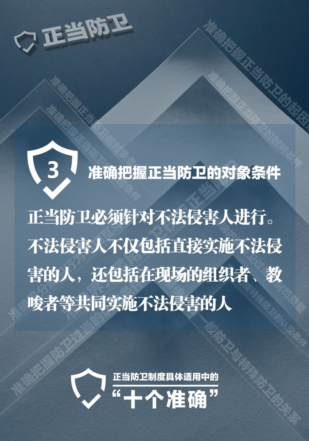 三是准确把握正当防卫的对象条件。正当防卫是“正对不正”,必须针对不法侵害人进行。但是,不能狭隘地将不法侵害人理解为直接实施不法侵害的人,而是也包括在现场的组织者、教唆者等共同实施不法侵害的人。对此,《指导意见》第七条作了明确。此外,《指导意见》第七条还规定:“明知侵害人是无刑事责任能力人或者限制刑事责任能力人的,应当尽量使用其他方式避免或者制止侵害;没有其他方式可以避免、制止不法侵害,或者不法侵害严重危及人身安全的,可以进行反击。”