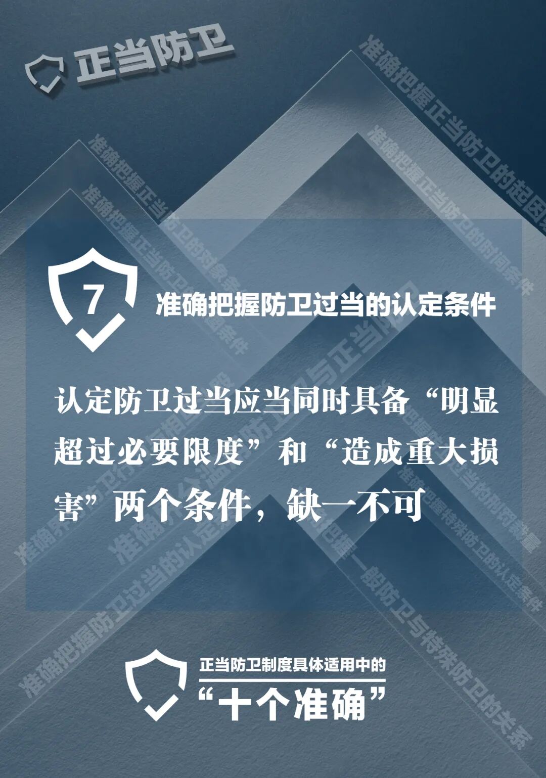 七是准确把握防卫过当的认定条件。与正当防卫相比,防卫过当只是突破了限度条件,即“明显超过必要限度,造成重大损害”。为统一法律适用,《指导意见》第十一条至第十三条明确:认定防卫过当应当同时具备“明显超过必要限度”和“造成重大损害”两个条件,缺一不可;判断是否“明显超过必要限度”,要立足防卫人防卫时所处情境,结合社会公众的一般认知作出判断;“造成重大损害”是指造成不法侵害人重伤、死亡。造成轻伤及以下损害的,不属于重大损害。