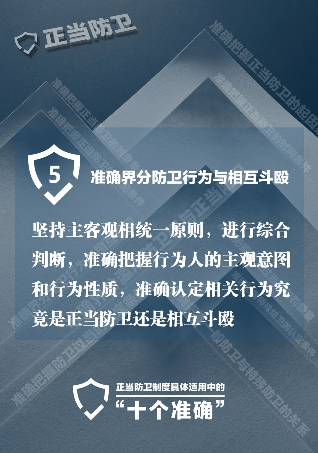 五是准确界分防卫行为与相互斗殴。正当防卫与相互斗殴都可能造成对方的损害,在外观上具有相似性,容易混淆。实践中,个别案件存在“和稀泥”“各打五十大板”的现象,只要造成对方轻伤以上后果的就各自按犯罪处理,模糊了“正”与“不正”之间的界限,应当加以纠正。《指导意见》第九条要求坚持主客观相统一原则,进行综合判断,准确把握行为人的主观意图和行为性质,准确认定相关行为究竟是正当防卫还是相互斗殴。