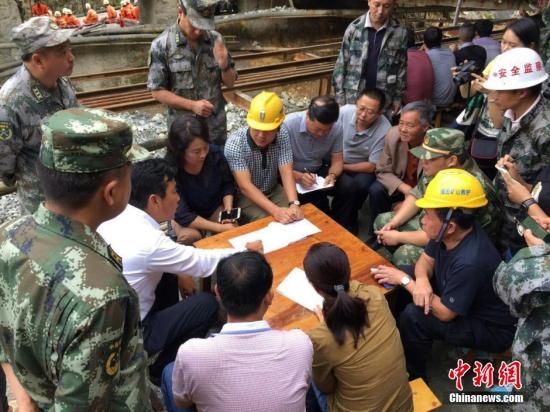 7月25日,救援人员在现场制定救援方案。当日中午12:56左右,云南梁河县光坪锡矿三车间受连日降雨影响,出现矿井塌方事故,有11名作业人员被困井下,塌方地点距采矿点有400多米,被困人员暂无生命危险,但因矿井较深暂时无法联系到井下人员,截至目前,救援在紧张进行中。中新社发 黄朝奎 摄