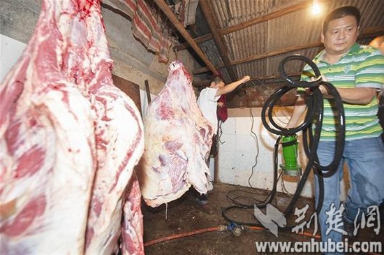今日凌晨零时许,硚口区食品药品监督管理局、硚口区公安分局经侦大队执法人员,对该屠宰场进行突击检查,发现两家屠宰间内的水池中有潜水泵,予以收缴,并对现场牛肉取样。
