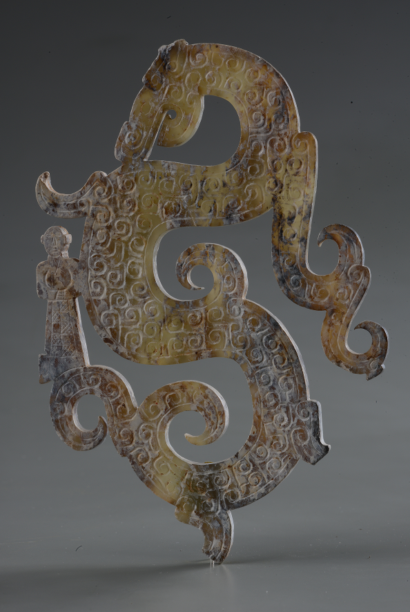 而来自荆州博物馆的人乘龙形玉佩,则生动体现了长江中游楚文化奇谲浪漫的想象力。玉佩透雕出盘旋飞舞的龙形,龙尾上倚立一人,手捧于腹,身着深衣。这种“神人乘龙”的题材,寄托了先民们“驷玉虬以椉鹥兮,溘埃风余上征”的梦想。正是这种对茫茫宇宙的无限求索促进着中华民族走向世界、走向太空,屹立于世界民族之林。