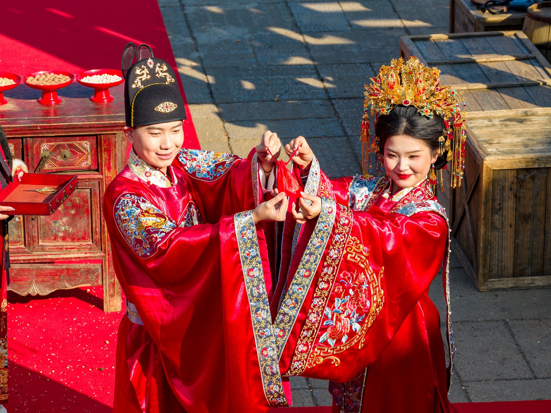 据湖北日报2月10日报道,开张不到一年的江夏里,1月24日就早早地上新了“码头潮玩庙会”。2月14日情人节当天, 江夏里更是上演一场“汉婚大赏”,用东方美学诠释了中国式浪漫,刷屏社交平台。水面烟气氤氲,两位船夫各撑一条竹编窄船缓缓驶来,身着明制婚服的“新人”立于船头,沃盥交拜、牵巾盟誓,每一个礼仪环节都经过严谨考据,红衣如霞与粼粼江水相映,构成一幅极具诗意的画卷。